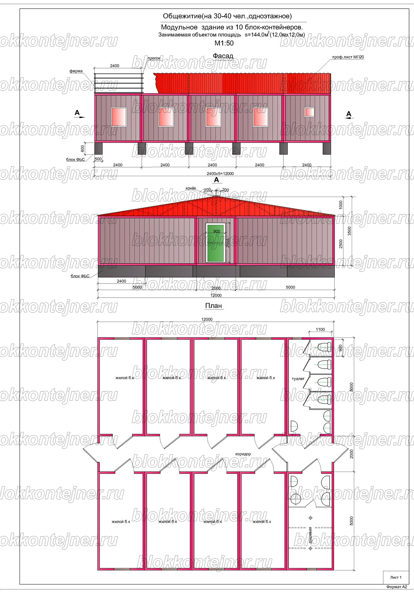 ГлавнаяПроекты готовых решенийМодульные здания → Одноэтажное общежитие на 30-40 человек, из 10-ти шт БК
